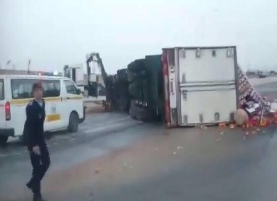 بالصور .. انقلاب شاحنة محملة بالبرتقال على الطريق الصحراوي